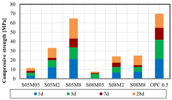 The highest compressive strength results were obtained for S05M8, whose results were similar to the compressive strength obtained for OPC paste with a W/C of 0.5.