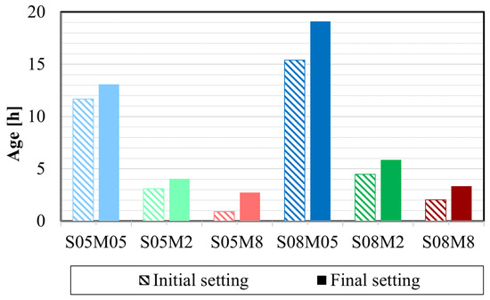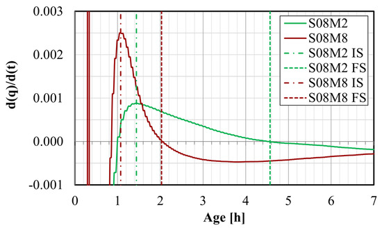 Finally, the setting times were evaluated based on the first derivative of the heat flow results. According to Hu et al. [67], the initial set (IS) corresponds to the time at which the first derivative is at its maximum. This corresponds to the moment where the heat generation rate is the fastest. On the other hand, the final set (FS) occurs when the first derivative is zero, indicating the highest rate of reaction, which decreases afterward. The procedure for determining the setting times for S08M2 and for S08M8 is represented in Figure 10.