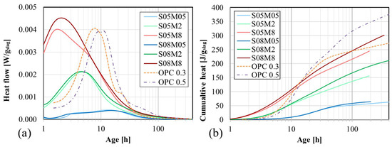 At an early age, the S/B ratio does not have a significant influence. Only after a few hours does the S/B ratio begin to impact the heat release, which increases with a higher S/B ratio. This trend can be observed in the cumulative heat results, as depicted in Figure 7b. In fact, for the same concentration, both S/B curves initially remain superimposed. After some time, the curves start to separate due to the different S/B ratios, as the alkali content decreases faster with time for a lower S/B ratio. Regarding the heat flow results, an increase in S/B does not change the amplitude of the second peak significantly. However, the second peak starts earlier and is prolonged due to the direct monomers polymerization [65].