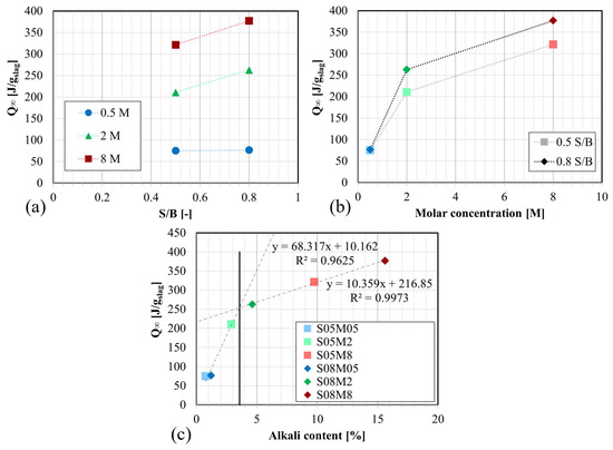 Ultimate heat of AAS pastes: (a) as a function of S/B; (b) as a function of the molar concentration; (c) as a function of the alkali content.
