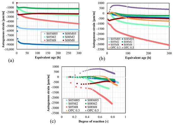 Autogenous strain of AAS pastes: (a) as a function of the equivalent age, t0 = ttest start; (b) as a function of the equivalent age, t0 = tFS,Vicat; (c) as a function of the degree of reaction, determined with Equation (4), t0 = tFS,Vicat.