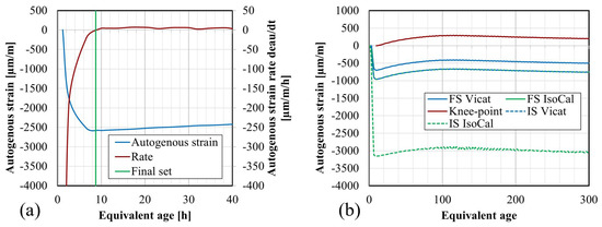 Next, the setting times are determined based on the knee-point method; see Figure 12a for composition S08M8. This method consists in plotting the rate of autogenous strain against the age and identifying the point where the rate reaches zero, which corresponds to the transition between the solid state and the fluid state of the paste [52]. In cases where the rate never became positive, typically those that do not exhibit apparent swelling, the maximum value is taken as the setting time. The results can be found in Table 6.