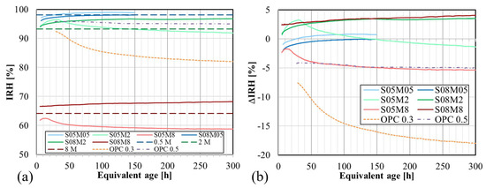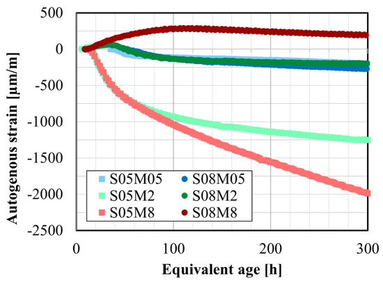 Figure 11a depicts the autogenous strain of AAS pastes, where time zero indicates the start of the test. As expected, the development of the autogenous strain exhibits three distinct stages. Initially, all compositions display significant shrinkage ranging from 1000 to 8500 µm/m, attributed to the chemical shrinkage of the paste as mentioned previously [25]. Compositions prepared with the 0.5 M solution exhibit higher initial shrinkage (approximately 5100 µm/m for S05M05 and 8400 µm/m for S08M05), while those made with 2 M and 8 M solution show less shrinkage: 1400 µm/m for S05M2, 1000 µm/m for S08M2, 2500 µm/m for S05M8, and 2500 µm/m for S08M8. However, it should be noted that the zero time of the test represents the time at which the acquisition started, which is not immediately after the mixing since the sample preparation takes between 45 and 75 min depending on the workability of the paste. Additionally, as seen beforehand, the Vicat setting times significantly depend on the studied properties (M and S/B). Therefore, some compositions such as S05M8 and S08M8 may already be close to their final set according to the Vicat procedure, whereas compositions like S08M05 may not have reached the initial set, potentially explaining the high shrinkage. The second stage, corresponding to swelling, is not fully evident for all compositions. When a 0.5 M solution is used, no apparent swelling is observed. However, the end of the shrinkage is clearly distinguishable, particularly when S/B is 0.5. S05M2, S08M2, and S08M8 exhibit swelling, respectively, 27 µm/m over 4.3 h, 71 µm/m over 25.9 h, and 295 µm/m over 106 h. Lastly, self-desiccation shrinkage occurs, characterized by a much slower rate compared with the initial shrinkage. At 300 h, it amounts to about 380 and 450 µm/m for S05M05 and S08M05, 1278 and 269 µm/m for S05M2 and S08M2, and 1981 and 87 µm/m for S05M8 and S08M8. For S05M05, S08M05, and S05M8, determining the actual self-desiccation shrinkage was challenging as no apparent swelling was observed for these compositions.