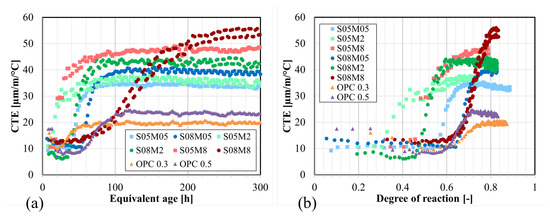 Figure 11b,c displays the autogenous strain as a function of equivalent age and degree of reaction, respectively. In this analysis, the autogenous strain was set to zero based on the final setting times obtained through Vicat testing (tFS, Vicat) for each composition, following the common practice for OPC compositions [9,57]. This approach facilitates a more detailed examination of the behavior of each composition once the chemical shrinkage has ended.