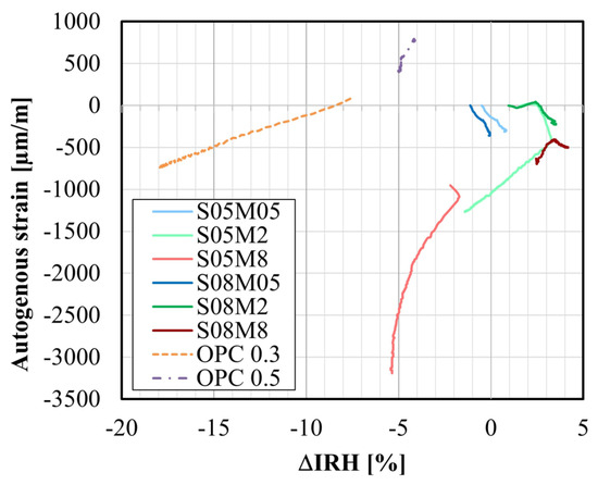Autogenous shrinkage for OPC can reach up to 1100 µm/m when its W/C is between 0.3 and 0.4 [9], while for AAM, it remains between 3000 and 8000 µm/m depending on the different parameters that characterize the AAM, such as alkali dosage and silicate modulus [31]. Ballekere Kumarappa et al. [32] and Uppalapati [25] have demonstrated that although the autogenous strain of AAM is reduced at mortar scale (between 1500 and 5000 µm/m) due to the restraint induced by the sand and the low E-modulus at early age when the autogenous strain develops, it remains substantially higher than that of OPC (about 500 µm/m).