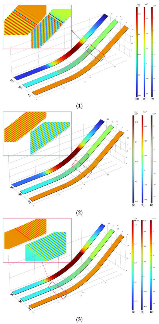 The relatively small thickness of the three layers in the ogee section of the facing is the main reason why the front of the impervious facings is primarily influenced by compressive stress, while the back is influenced by tensile stress. As shown in Figure 13(1–3), where (1), (2), and (3) represent the conditions for (m−1), (m−1), and (m−1), respectively, a larger curvature predominantly causes greater compressive stress on the front and tensile stress on the back of the facings.