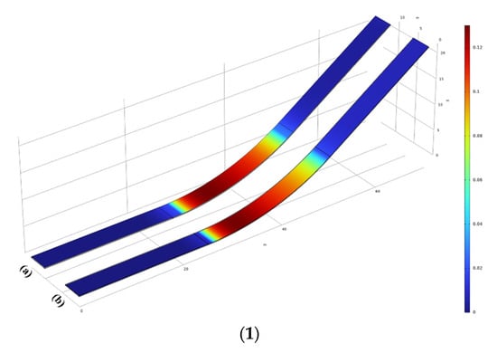 According to the equation above, and are the energy release rates for the tension and shear mode, respectively, and is the mixed-mode index. Based on the equation above, the failure displacement can be defined as [35,36]: