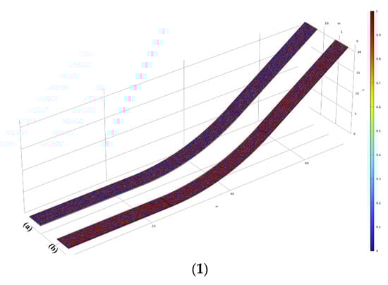 To generate the strength values following the Weibull distribution in space, the boundaries of a geometric figure are defined as the upper and lower limits of a random coordinate interval. Within this coordinate interval, the 1.2 × 107 spatial points and random intensity values obeying the Weibull distribution are generated by MATLAB, ensuring no missing values on the grid calculation nodes. Subsequently, each random strength in the spatial domain is combined with spatial coordinates to form a dataset . Next, interpolation functions and are created to call upon the data files generated by MATLAB. These functions are invoked when assigning contact interface strength values. A set of interface random strength cloud maps, represented in Figure 5, is plotted. Please note that the geometry used in Figure 2 corresponds to the case of the random strength distribution at curvature m−1 in Section 2.2. For other interfaces with different radii/slopes, the generation of random strengths follows the same method, as shown in Figure 5. According to Figure 5a,b, they depict the random distribution of shear strength and tensile strength at the interface of the seal layer and impermeable layer for combination , respectively, while Figure 5c,d represents the random shear/tensile strength distribution of the impervious layer–leveling and bonding layer interface for combination.