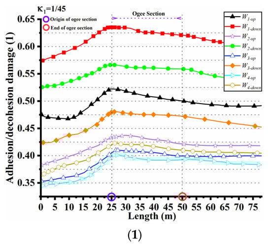 Analysis of Figure 16(1–3) reveals the presence of adhesion–decohesion damage at the interfaces between the first and second layers. Through the processing of the associated damage data, we have derived the interface damage profiles under a range of curvature conditions, as demonstrated in Figure 17(1–3). These profiles indicate an initial gradual ascent in the adhesion–decohesion damage on the left side of the ogee section, culminating in a peak at the section’s summit, beyond which the damage decrements progressively. This observed pattern of damage progression closely corresponds to the predictive trajectory of the Mazars damage model. It is particularly observed that an augmented curvature within the ogee section is correlated with an escalated magnitude of adhesion–decohesion damage.
