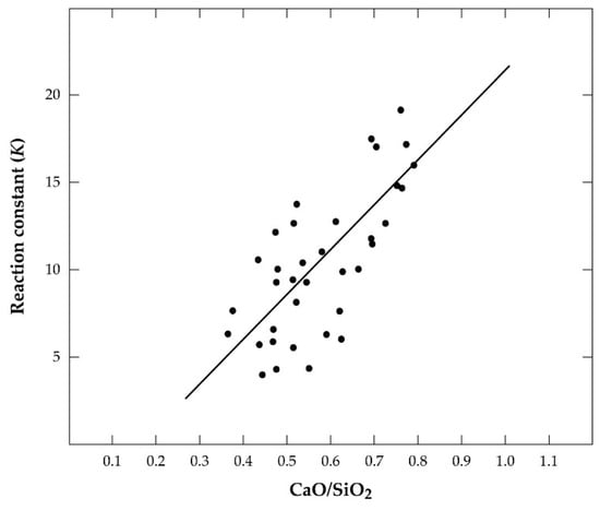 From the equilibrium constant Keq = , it can be concluded that a direct relation exists between Sn and Fe recovery and either the crude metal or the hardhead. Thus, to avoid the significant dissolution of iron into the crude metal or hardhead, some Sn must also be sacrificed and afforded to the respective slags. This assertion has been confirmed by a further revelation that the phenomenon is more prominent in the later-stage smelting than the former, with the CaO-SiO2 ratio in the secondary slag affecting the activity of both FeO and SnO and, hence, the equilibrium constant [2,19]. From production data and linear regression analysis, Equation (9) was developed to relate the equilibrium constant, K, CaO-SiO2 ratio, and results presented in Figure 2 [19].