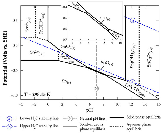 Figure 4 is a Sn-H2O Pourbaix diagram constructed by Palazhchenko [31] using literature information gathered at 25 °C.