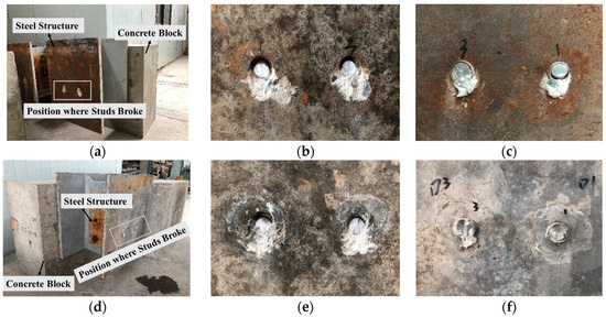 Failure modes of stud connector specimens. (a) Specimen SN12-A. (b) Concrete side (SN12-A). (c) Steel side (SN12-A). (d) Specimen SS12-A. (e) Concrete side (SS12-A). (f) Steel side (SS12-A).