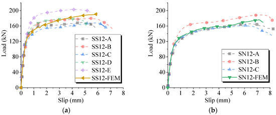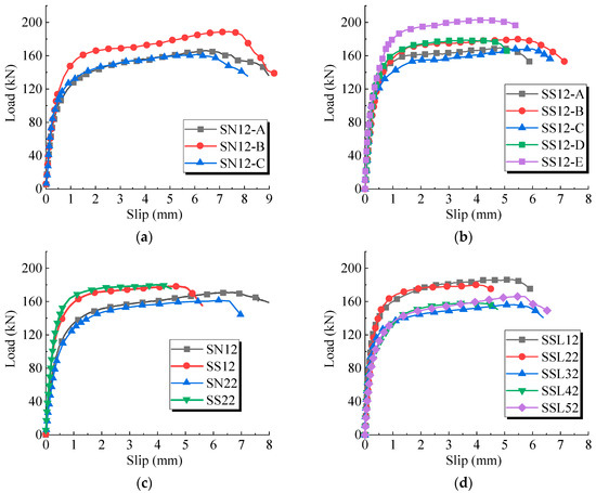 Load–slip curves in the push-out tests. (a) SN12. (b) SS12. (c) SN22 and SS22. (d) SSL group.