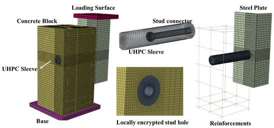 In order to further analyze the shear performance of the sleeved studs, Abaqus (Version 6.3) finite element (FE) models were established based on the test specimens. Considering the symmetry of the specimens, only a quarter of the FE model was built, as shown in Figure 7. The model included steel sleeves, concrete blocks, steel structures, reinforcements, and welded studs. The concrete block was composed of UHPC and ordinary concrete. Simultaneously, reference points were set at the center of a rigid base to obtain the reaction forces (a 10 mm loading displacement).