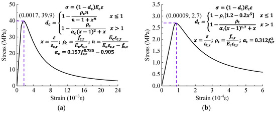 Constitutive models of C50 ordinary concrete. (a) Compressive stress; (b) Tensile stress.