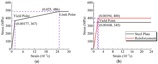 The stress–strain curve for the material of the welded studs followed a three-segment model, as depicted in Figure 10a. Yield and ultimate stress were initially determined by material testing, which were respectively 368 MPa and 498 MPa. The ultimate strain was set at 2.5%, and the elastic modulus was assigned a value of 207 GPa. The stress–strain curves for both steel plates and reinforcements were modeled using a two-segment model, as illustrated in Figure 10b. The yield stress values were 345 MPa and 400 MPa for steel plates and steel reinforcements, and the elastic modulus was set to 206 GPa [10].