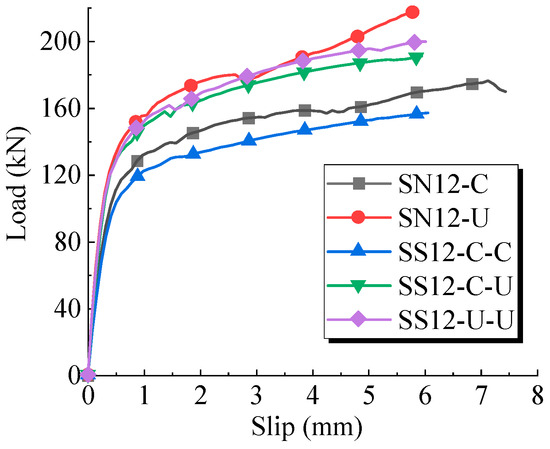 Figure 6c distinctly illustrates the shear performance differences. The sleeved studs exhibited higher shear bearing capacity and stiffness than the conventional welded studs, with a relatively smaller slip at the onset of ultimate bearing capacity.