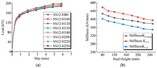 (a) Load slip curves of welded studs with different heights. (b) The influence of height variation of welded studs on shear stiffness.
