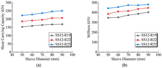 (a) Variation of ultimate shear bearing capacity with sleeve diameter (b) Variation of shear stiffness with sleeve diameter.
