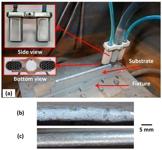 (a) Supplementary shielding-gas nozzles coupled to the welding torch, also emphasising the substrate and fixture during the wall building-up; the layer top surface appearance, (b) without and (c) with the use of the additional shielding.