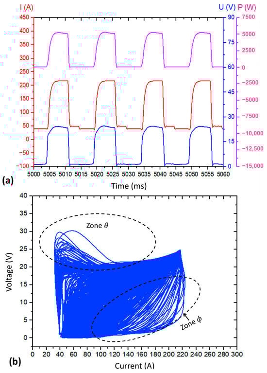 Wall deposition with Blend 1 (Ar + 2%CO2), WFSset= 4.9 m/min; DSset = 35 cm/min, CA = −30 and CD = −4): (a) Current (I), voltage (U), and power (P) oscillograms; (b) cyclogram of voltage × current.