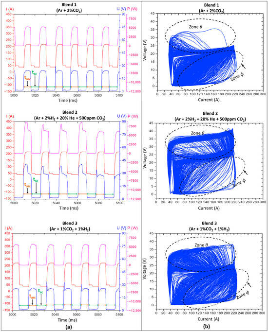 Applying the defined assessment parameters in Section 2.3.1, Figure 3 illustrates the current, voltage, power oscillograms, and the cyclogram obtained for Blend 1 (Ar + 2%CO2) from this preliminary experimental stage. Despite the high metal transfer regularity quantified by the IVsc of 0.05 (the lower, the better) and verified by visualisation of the oscillogram of Figure 3a (regular and periodic behaviour of current and voltage signals), the cyclogram shown in Figure 3b presents high dispersion between the voltage × current traces. These traces are formed by the different arcing and short-circuiting cycles, mainly within the two highlighted zones (θ and ϕ) outlined in the side (b) of the figure.