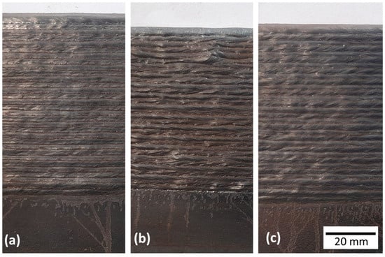 Surface finish (after cleaning with a steel brush) of the walls, using as shielding gases: (a) Blend 1 (Ar + 2%CO2); (b) Blend 2 (Ar + 2%H2 + 20%He + 500 ppm CO2); and (c) Blend 3 (Ar + 1%CO2 + 1%H2).