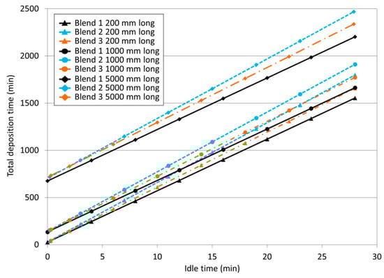 Figure 9 presents the results of the total deposition time (TDt), considering different idle times (It), hypothetically defined, and wall lengths. Naturally, the longer the It and wall length, the longer the TDt, regardless of the shielding gas. TDt was always shorter for the same layer length with Blend 1 (black lines), followed by Blend 3 (orange lines). In this way, Blend 2 delays the production of a wall with the same dimensions (length, height, and width). In addition, the longer the It, the more significant the difference among the evaluated gases, since the lines are further apart. These outcomes emphasise the importance of using forced cooling to speed up production (not used here, but applicable). They also show the effect that different gases can have on Tdt.