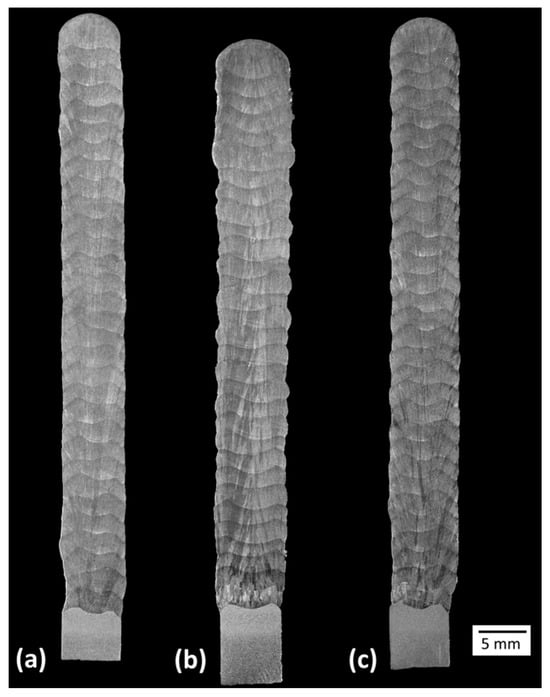 Cross-section macrograph of the walls: (a) Blend 1 (Ar + 2%CO2); (b) Blend 2 (Ar + 2%H2 + 20%He + 500 ppm CO2); and (c) Blend 3 (Ar + 1%CO2 + 1%H2).