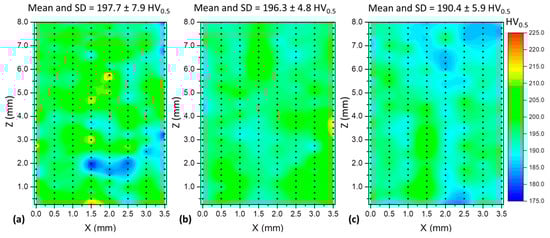 Microhardness maps of the walls: (a) Blend 1 (Ar + 2%CO2); (b) Blend 2 (Ar + 2%H2 + 20%He + 500 ppm CO2); and (c) Blend 3 (Ar + 1%CO2 + 1%H2) (the black dots represent the indentation positions).