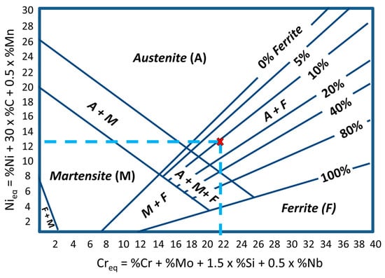 Fe–Cr–Ni pseudo-binary diagram, considering 63% (by weight) Fe and Creq = 22% and Nieq = 13%.