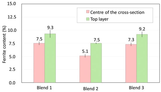 To complement the discussions, Figure 15 presents the δ-ferrite contents quantified using a Feritscope along the centre length of the walls and in the last deposited layer (see Section 2.3). As seen, the ferrite contents in the last layer were close to the value estimated by the Schaeffler diagram (9%) for Blends 1 and 3. However, there was a reduction of δ-ferrite when Blend 2 was employed to shield the arc. Comparing the measurements of the top deposited layer with the ones in the wall centre, the δ-ferrite content is always lesser in the centre of the wall, indicating a partial dissolution of ferrite in the microstructures of all cross-sections built with the three shielding gases evaluated. It is worth noting that Blend 2 (Ar + 2%H2 + 20%He + 500 ppm CO2) showed the most significant difference in mean values (2.4%), suggesting consistent greater dissolution of δ-ferrite. Due to the presence of gases with high heat exchange capacity (mainly He at 20% by volume) and also to the higher arc energy during depositions (Table 1), higher heat input may have been obtained with Blend 2. If this occurs, lower cooling rates would be obtained, and longer times below the γ-solvus line could be achieved, even in the top layer, but in particular after multiple thermal cycles. This potential higher heat input would indirectly justify the higher observed ferrite dissolution.