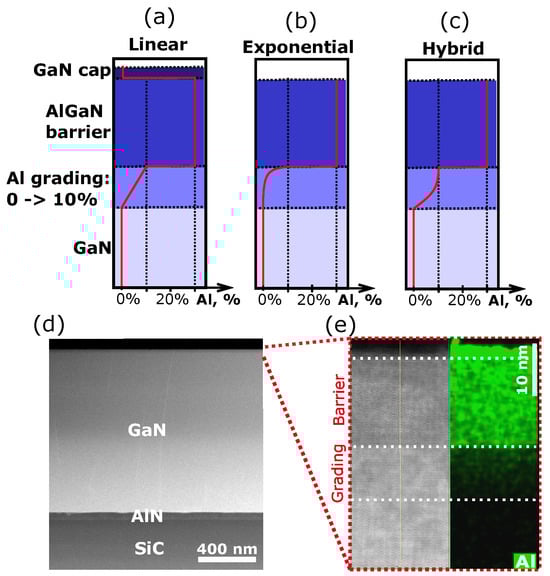 Graded channel AlGaN/GaN HEMT structures: (a–c) schematic drawings of the heterostructures with the nominal Al grading profiles in the channel, (d) STEM image of the linearly graded HEMT structure and (e) the EDS map of Al distribution in the vicinity of the AlGaN/GaN interface.