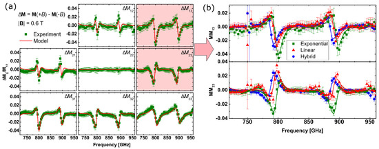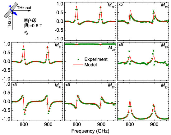 The THz OHE measurements were performed in reflection geometry (angle of incidence 45°) using the permanent neodymium magnet (0.6 T) and employing a backside cavity [37]. The measurements were taken at both sides of the neodymium magnet, resulting in two opposing magnetic field directions (M[]). The Mueller matrix spectra for positive magnetic field (M[]) are shown in Figure 4. Most of the Mueller matrix spectra contain distinct spectral features modulated by the Fabry–Perot oscillations within the mirror(magnet)–cavity–sample optical system. The red solid lines indicate the best-match model data, which can be seen to be in perfect agreement with the experimental data points.
