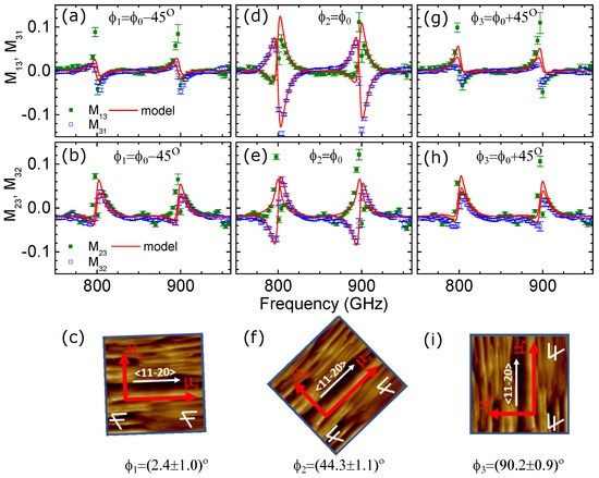 Experimental (symbols) and the best-match model (solid lines) THz-OHE off-diagonal block Mueller matrix elements spectra (, , , ) for N-polar GaN/AlGaN HEMT structure measured at 3 different azimuth orientations (a,b—, d,e—, and g,h—). The azimuth angles obtained from the best-match optical model representing the angle between the fast mobility axis and the plane of incidence, and the AFM images showing the absolute sample orientation for each measurement are depicted in (c,f,i).