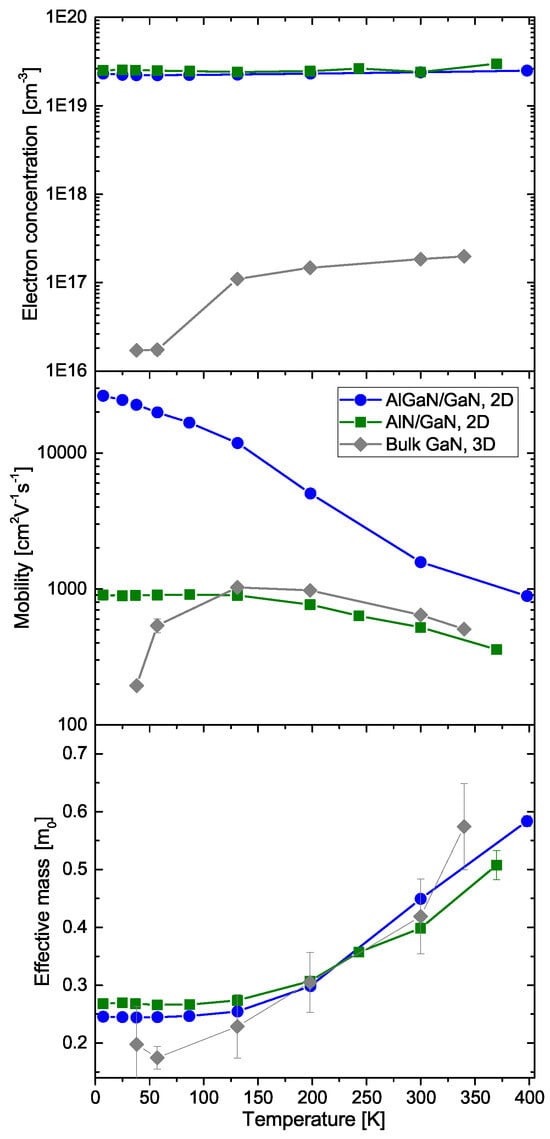 Temperature dependence of electron concentration, mobility and effective mass parameters of 2DEG in AlGaN/GaN (nominal Al content of 29%) and AlN/GaN HEMT structures, and bulk carriers (denoted as 3D) in GaN substrate doped with Si (nominal Si concentration ) [31]. The electron concentration for the AlGaN/GaN and AlN/GaN HEMTs structures is calculated from the sheet density parameters , obtained from the THz OHE analysis, and assuming a 4 nm layer thickness and uniform distribution across the channel ().