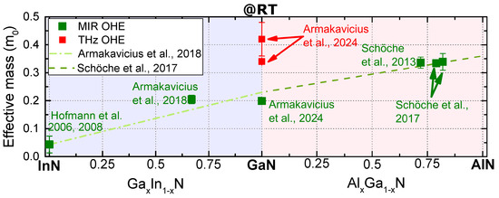 Table 2 summarizes the published effective mass parameters obtained via Drude model-based analysis of the THz OHE measurements of various group-III nitride heterostructures containing 2DEG conductivity channels. The RT electron effective mass parameter of 2DEG is close to 0.30 for HEMTs with a GaN channel. This value is higher than the well-accepted value of 0.23 for bulk GaN. The latter, however, is primarily determined by infrared spectroscopy, cyclotron resonance or Shubnikov–de Haas oscillations techniques at low temperatures. The 2DEG effective mass parameter of high Al content AlGaN channel HEMT is even higher than . Figure 7 summarizes the bulk effective mass parameters obtained from MIR OHE for group-III nitride materials [24,25,26,50,59,60,61,62,63,64]. The bulk effective mass parameter for GaN obtained from THz-OHE is included for comparison and can be seen to be significantly higher [31].