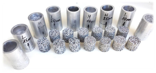 The present research focuses on the energy-absorbing behaviour of closed-cell aluminium foam to which the base material was manufactured by Behai Composite Materials Co. (Jiujiang, China) in the form of 600 × 600 × 30 mm blocks with two different densities, numerically 0.4 and 0.7 g/cm3 [35]. The chemical ingredients of the foam were as follows: 97% aluminium powder, 3% foaming agent, 1% TiH2, increasing viscose, and 2% Ca. They are environmental protection elements that have no pollution. For the compressive test, 30 mm diameter and height specimens were made using a waterjet cutting process. Owing to the precise cutting process, the specimens had a consistent height and diameter which were measured using a digital calliper at more points along the foam’s height. To not influence the test results by the possible inner material or structure issues of foam specimens, all of the measurements were repeated three times to increase the statistical meaning, but the later results are around the mean of values. During the radially constrained investigation, the foam specimens were inserted into a 30 mm inner diameter aluminium tube with a wall thickness of 5 mm and 65 mm height and compressed using a pushing plate with a 28 mm nominal diameter and 3 mm thickness. The tube preparation did not require any type of surface finishing or machining over the cutting up with 65 mm. Considering the material of the tube and pushing plate, the AlMgSi AW EN6061 was applied as one of the frequently used materials in the field of automotive construction, mainly in the bumper system and its accessories. Between the test machine crosshead and the pushing plate, a so-called push rod was inserted in the form of a 28 mm nominal diameter tube. The prepared specimens before the test are presented in Figure 1, whilst their geometry data are collected in Table 1. According to the dimensions and weights, the theoretical densities are confirmed.
