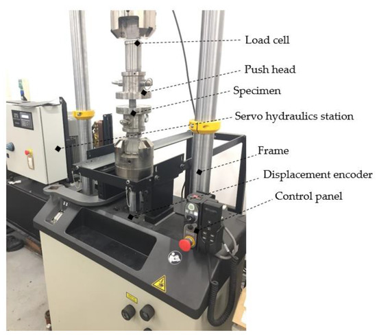 For the test, a INSTRON 8801 servo hydraulics material fatigue test machine was used, connected with a data collector and analysis software, namely WaveMatrix v.2, to record the force and displacement values. The velocity of the crosshead of the test machine was constant at 1 mm/s, whilst the system data recording frequency was 1000/s. The displacement is recorded using an implement displacement encoder, and the force is detected using a load cell with a limit of 100 kN. The measurement was carried out in an accredited laboratory and the measuring instrument had a valid calibration and verification logbook at the time of measurement. Before the test, owing to the prevention of technical integrity of the load cell, the 80 kN maximum force limit was adjusted; if this condition was exceeded, the operation was immediately blocked. The components of the test machine are in Figure 2.