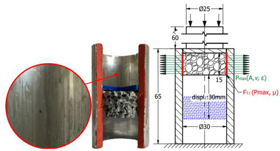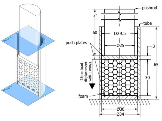 The main goal of the present investigation is to reveal the effect of friction concerning the radial constraint between the foam and tube compared with the uniaxial (without radial constraint) test. First, the foam was loaded using the crosshead without any radial inhibitor, resulting in a uniaxial compressive test. As a continuation of the test, the foams were inserted into the above-mentioned aluminium tube. The scheme of the radial constrained version can be seen in Figure 3.