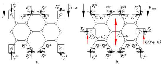 During the test, the foam is loaded using axial compressive force inside the aluminium tube. Considering the Poisson effect of materials, the compression or tensile load is accompanied with radial strain [36]. In this case, the compression caused by radial strain is inhibited by the wall of the tube. Considering the closed foam structure as a 2D hinged structure, the DoF of its lateral node is blocked in the direction of the y-axis, increasing the stiffness and strength of construction. The simplified structures with nodes can be seen in Figure 4, where . is the force of the compressive load by the node, . is the supporting or reaction force, radial normal force, whilst represents the friction force.