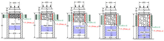 Considering the five different compression states—owing to the Poisson effect—the radial/normal force () between the tube wall and the foam gets higher and higher whilst the area of the contact surface is modified, influencing the friction resistance during the foam displacement inside the tube. The concepts are introduced in Figure 5. The meaning of the colours is next. The green vectors describe the radial normal force () generated by the Poisson effect. The direction of vectors shows the direction of radial force loading the wall of the tube, whilst the length of them represents the magnitude of this normal force. The red lines indicate the friction force which is influenced by the and friction coefficient (). The blue hatched area symbolises the final position of the pre-compressed foam after they were pushed away inside the tube with a 30 mm displacement.
