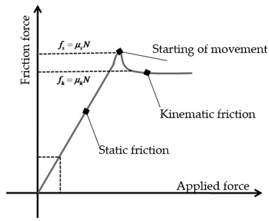 where μ is the friction coefficient, whilst is the normal force between the connected objects. Physics fundamentals include the ideas of static and kinetic friction, and during the present test, both of them must be considered. Kinetic friction happens between surfaces that are moving, whereas static friction is the force that stops an item from moving when a force is applied [41,42,43]. While the coefficient of kinetic friction affects kinetic friction, the coefficient of static friction determines the amount of static friction concerning the normal force. Static friction often outweighs kinetic friction. The theoretical graph of the friction issue is introduced in Figure 6.