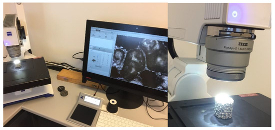According to the science of friction, the contact surface size is not a crucial parameter during the investigation of friction issues. According to Figure 5, in this case, the normal force () and the size of the contact area are also changed continuously, affecting the friction resistance and influencing the energy requirement for the movement of pre-compressed foam. Due to the porous structure and surface of metal foams, it is not easy to define the exact area of contact surfaces of specimens inside the tube. To be informed about the scale of the contact area of cylindrical specimens, we performed microscopic analysis. For the image acquisition, the Zeiss Smartzoom 5 smart digital microscope was used with its own official Zeiss Zen v3.8 core software, presented in Figure 7.
