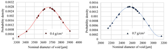 Using the built-in digital measurement tools of the microscope, it is easy to measure the size of void inclusions and calculate the average distribution density. The print screen of the microscopic view with the dimension measuring tool is in Figure 8. Both density-type foams were subjects of the microscope measurements and presented the standard deviation in the Gauss diagram, whose results can be seen in Figure 9. The average void inclusions are 3680 µm and 2570 µm in the case of 0.4 g/cm3 and 0.7 g/cm3 density foam, respectively.