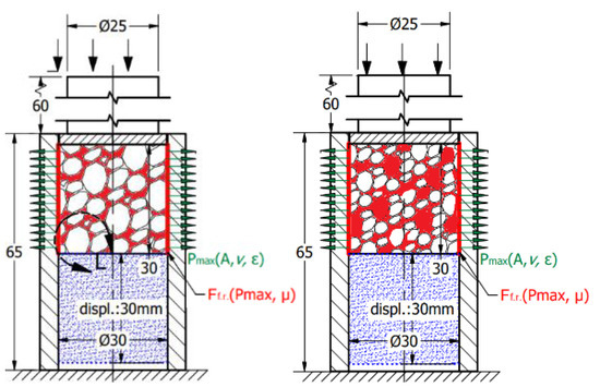 To reveal the size of the contact surface between the foam and tube wall, a 100 mm2 unit area was first taken into account, where the number of cells can be easily to counted using a digital microscope and then extended for the whole surface of the cylindrical specimen, considering the aforementioned and detailed standard deviations. According to this method, 14.6 cells can be accounted for per unit of 100 mm2 area in the case of 0.7 g/cm3 type foam, and 8.3 cells in the case of 0.4 g/cm3 foam. Applying this calculation to the entire casing of the cylindrical test specimen, the contact area is the sum of the wall thicknesses between the inclusions on the surface. In the case of the 30 mm in diameter and height cylindrical solid specimens, they would have a 9.42 cm2 surface. Considering the number, size and deviation of void inclusions, the outer contact surface of foam is 2.42 cm2 in the case of denser foam, and 1.13 cm2 in the case of 0.4 g/cm3 type foam. These values are considered in the case of foams before the loading. Compressing the foam results in more and more cell deformation involving contact surface modification. The representation of this contact surface issue by the 0.4 and 0.7 g/cm3 foam is introduced in Figure 10, painted in red.