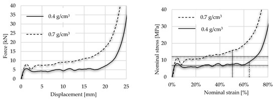 As the first step, the foams were loaded by 1 mm/s without any type of radial inhibitor accessories. The foam graph followed the typical force–displacement diagram with linear elasticity, plateau and densification. To obtain a stress–strain curve, compressive force must be divided by the initial cross-sectional area perpendicular to the loading direction. The effect of foam density can be considered; concerning the first maximum force, lighter (0.4) and denser (0.7) foam have 5.66 kN and 7.94 kN, respectively, as the first local maximum in the force–displacement curve. During the test, the ISO 13314 (2011) standard is taken into consideration, according to which the plateau stress is the arithmetical mean of the stresses at 0.1% or smaller strain intervals between 20% and 30% or 20% and 40% compressive strain [59]. The mean value of plateau stress was less with 15% in the case of lighter foam than the denser one. Numerically, the average stress in the plateau zone was 6.92 MPa concerning lighter ones and 12.26 MPa in the case of denser. The end of the plateau zone is defined by the above-mentioned ISO standard as the point in the stress–strain curve at which the stress is 1.3 times the plateau stress. Considering this rule, it is easy to define the densification point of the specimen, numerically 64.28% and 50.53% regarding the lighter and denser foam, respectively. The graphs of the free compression tests are presented in Figure 11, where the vertical dotted lines indicate the end of plateau.