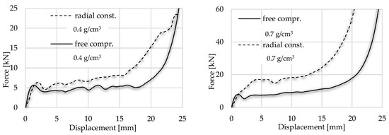 The hypothesis according to which the radially constrained foam results in a higher energy level during its compressive load is confirmed by the present investigation as well. The typical sections such as linear elastic zona, plateau and densification can be observed in this test situation as well. However, the plateau zone has a shorter length and a slight steepness compared with the uniaxial load version. During this compressive load, the force displacement shows higher characteristics, explained by the above-mentioned apparent strength increase and friction. Numerically, the plateau zone in this case can be characterised with 24.48 MPa in the case of denser foam, while with the lighter foam, this value was 9.51 MPa. Another significant deviation between the two concepts was the densification strain. The results of the radially constrained test are in Figure 12 and are compared with the uniaxial load.