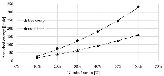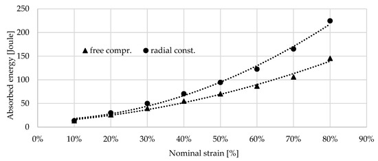 As it was mentioned above, the loading was limited at 80 kN due to the prevention of the overloading of the load cell; therefore, the radially constrained compression test of the 0.7 g/cm3 foam was able to run up to a strain of 66.29% which only corresponds to the displacement of 19.88 mm. The energies are collected in Table 3 and Table 4; these are presented in Figure 13 and Figure 14.
