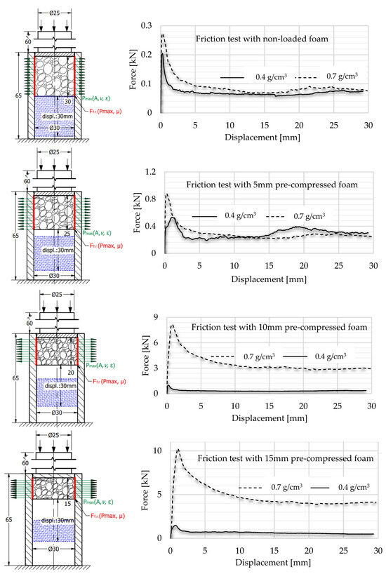 Firstly, the 0.4 g/cm3 foam was partially loaded by 5 mm compression displacement. Then, the pre-compressed foam was pushed via the tube from the other direction via the tube with 30 mm of displacement whilst the force–displacement curve was recorded to obtain a friction chart about the movement. The measurement was continued by pre-loading another foam specimen with a displacement of 10 mm and then pushing it through the tube from the other direction with a displacement of 30 mm. This step was followed with 15 and 20 mm pre-loading and friction measurements. Naturally, the process was repeated, involving 0.7 g/cm3 foam as well.